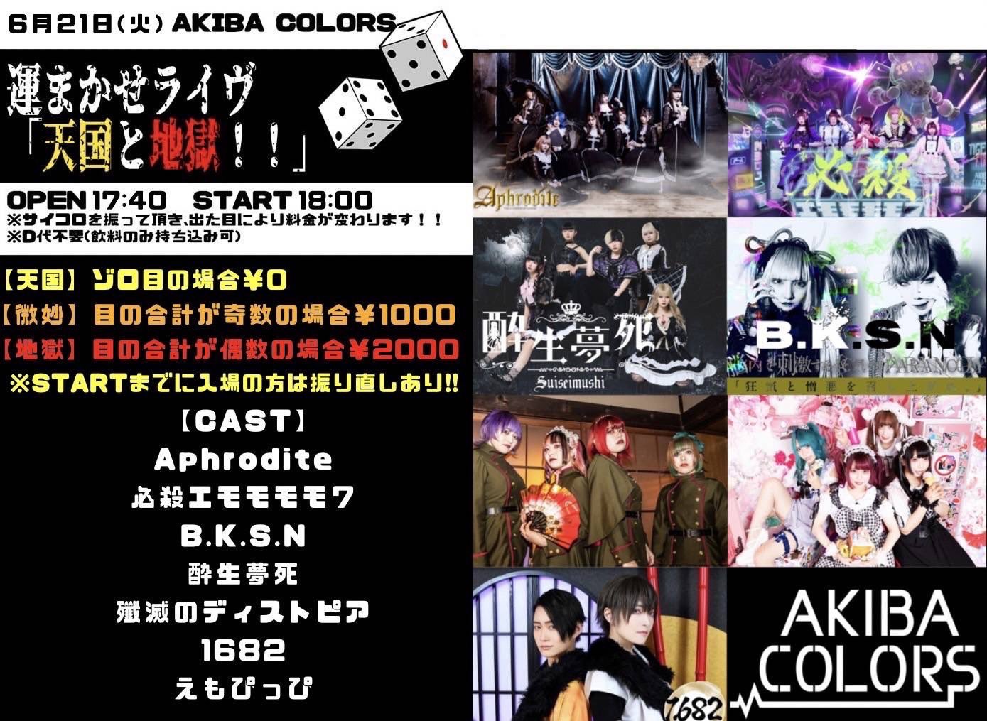 酔生夢死 すいせいむし 6月21日 火 天国と地獄 Akibacolors Op17 40 St18 00 チケット代がサイコロの目で決まります 天国 ゾロ目 0 微妙 奇数 1000 地獄 偶数 00 Startまでに入場の方は振り直しあり 19 50 15 50